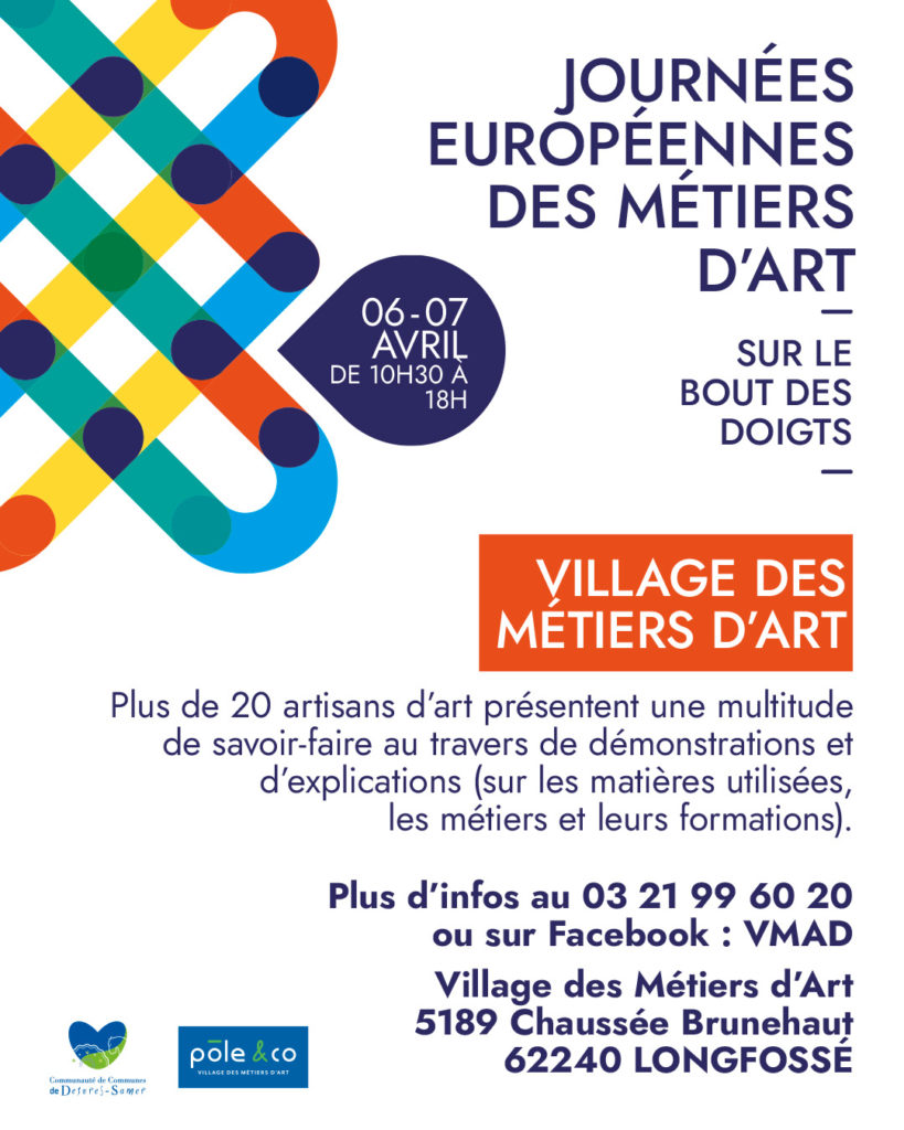 Du vendredi 10 au dimanche 12 avril 2026, la Communauté de Communes de Desvres-Samer vous donne rendez-vous au Village des Métiers d’Art de Desvres (Longfossé) à l’occasion des Journées Européennes des Métiers d’Art (JEMA).